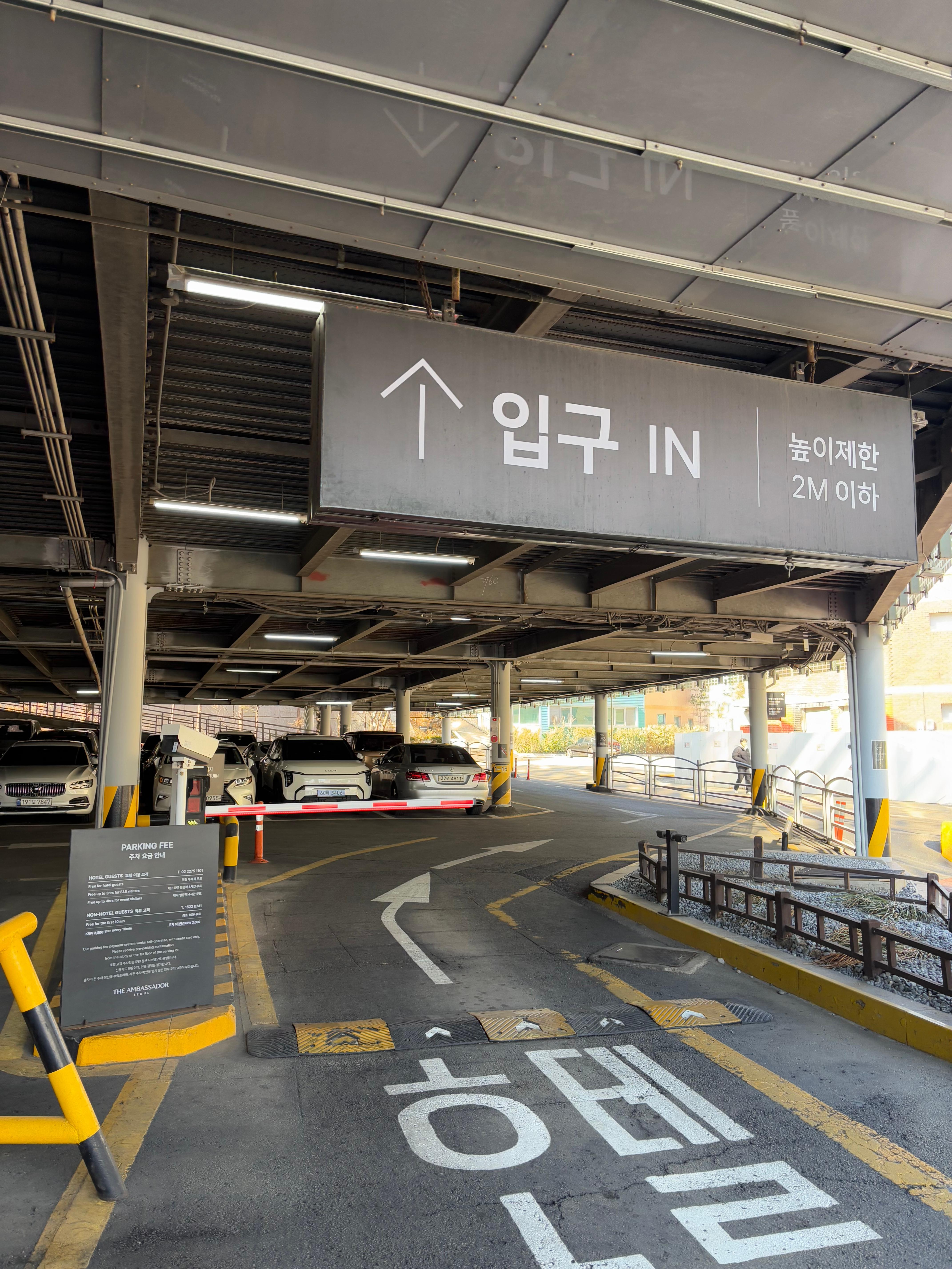 주차장 위치는 외부 주차타워예요! 호텔 정문 지나 왼쪽에 위치하고 있어요.